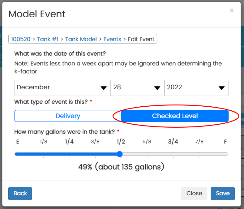 For the most part, the differences between the estimated level and the actual level should be negligible and should automatically correct when the next delivery is made. However, if you see a tank that has an estimate that is very far off, you may want to manually add an event to the tank model.