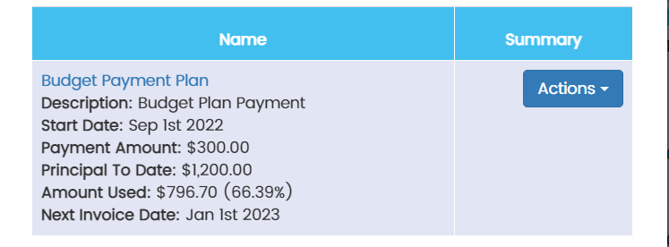 To see a summary of how far along a customer is in his or her budget plan, click on Recurring Invoices and a summary will be provided.